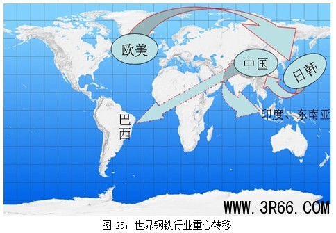 1.1 世界钢铁行业概述 现代钢铁工业始建于19世纪初期,至今已有100多年历史。在过去的100多年里,钢铁工业得到了飞速的发展,无论是在产值、产品结构,还是在工业技术方面都有了前所未有的提高。同时,世界钢铁产业也经历了三次重心转移:第一次是美欧领导的增长,从1880年到1970年美国一直位于世界钢铁工业的领导者地位,占据世界总产量35%到60%,1973年达到历史高点1.368亿吨。自50年代战后重建,日本、德国、法国钢铁工业开始了复苏和追赶步伐。第二次是重心由美欧向日韩转移,受70年代能源危机影响,美欧钢铁在全球的地位开始下降,钢铁产业开始向东亚(日本、韩国)转移。1973年,日本粗钢产量超过1亿吨,1993年到1995年成为全球第一大产钢国。第三次是重心由日韩向中国大陆转移。20世纪90年代开始,全球钢铁业向中国大陆转移。 1996年,中国大陆粗钢产量超过1亿吨,成为全球最大的产钢国。而目前,有专家称第四次重心转移即将开始,预计未来全球钢铁业的增长区域主要在印度、巴西、独联体、东南亚、中东等新兴国家和地区。 ![]() 1.1.1 2011年全球粗钢产量“量增速减”