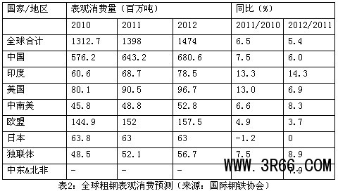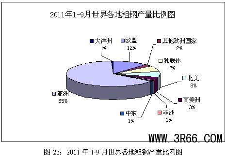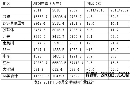 随着世界经济缓慢复苏,全球粗钢产量也逐步恢复增长,但由于欧美债务危机再度爆发,2011年粗钢产量增速较2010年明显放缓,非洲、澳洲等局部地区甚至出现负增长(表1)。2011年1-9月,世界66个主要产钢国家和地区粗钢总产量为11.34亿吨,较2010年同期产量增长8.2%,增速下降 11.2%。其中,欧盟27国产量为1.36亿吨,同比增长4.3%;独联体产量为8467.5万吨,同比增长5.6%;北美产量为8926.6万吨,同比增长6.1%;亚洲产量为7.28亿吨,增长9.5%。 ![]() ![]() 1.1.2 2012年全球钢铁需求难有强劲增长