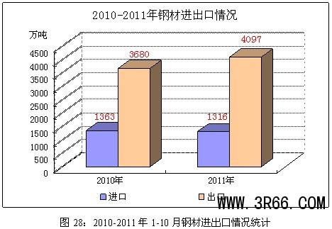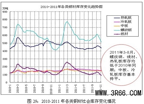 2011年1-10月,我国共出口钢材4097 万吨,同比上升11.3%,出口均价为755.8美元/吨,同比下降409.4美元/吨;共进口钢材1316万吨,同比下降3.5%,进口均价为 1383.4美元/吨,同比上涨167.7美元/吨。可以看到,钢材出口总量虽同比有所上升,但均价却大幅下降。这主要是受国际经济复苏依然面临着诸多不确定因素及贸易保护主义的影响。 ![]() 3)螺、线、热轧库存低于历史同期,高端板材基本持平