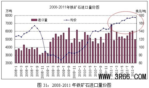 受保障房需求拉动,2011年3-8月,全国螺纹钢、线材社会库存均明显低于2010年同期,整体呈现产销两旺态势;而中板、冷轧等品种钢材因造船业、制造业不景气,库存与2010年基本持平(图29)。 ![]() 4)淡季不淡、旺季不旺,价格居高回落