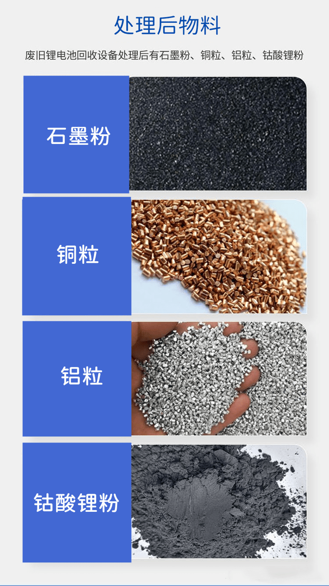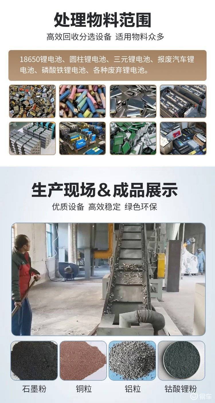 锂电池回收加工设备生产线是一种新型的环保设备生产线。 锂电池回收加工设备生产线是一条全封闭的全自动精拆回收技术设备线。 成套设备自动化程度高、排放低、无环境污染、分离效率高。 属于新技术、新工艺、新产品。 ,同时配备除尘设施和烟气净化设施,可适用于三元锂电池、动力电池、锂电池正负极、磷酸铁锂电池、镍酸锂电池、锂电池 锰酸盐电池、软包锂电池、圆柱形锂电池、铝壳锂电池、手机等电子产品锂电池的分离回收。