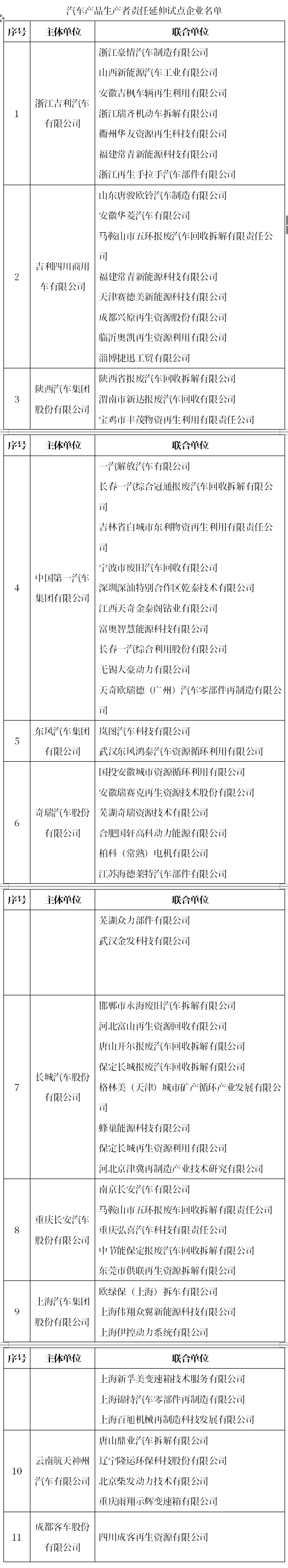 为贯彻落实《国务院办公厅关于印发生产者责任延伸制度推行方案的通知》,引导汽车生产企业履行生产者责任,经地方推荐、专家评审和网上公示,工业和信息化部、科技部、财政部、商务部确定了11家汽车产品生产者责任延伸试点企业名单,现予以公布。