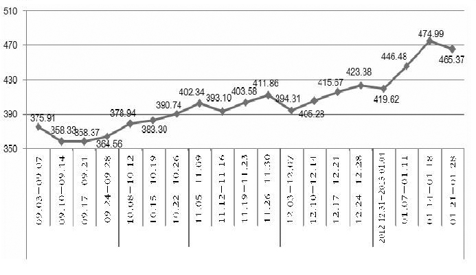 1月21日~1月25日,中国铁矿石价格指数为465.37点,比上周下降9.61点,降幅为2.02%。其中,国产铁矿石价格指数为367.71点,比上周上升0.32点,升幅为0.09%;进口铁矿石价格指数为518.66点,比上周下降15.03点,降幅为2.82%。 国产铁矿石平均价格为946.18元/吨,比上周上升0.83元/吨;进口铁矿石平均到岸价格为140.09美元/吨,比上周下降4.06美元/吨,折合人民币含税价格为1029.41元/吨,比上周下降28.94元/吨。(见下表) 中国铁矿石价格指数变化表