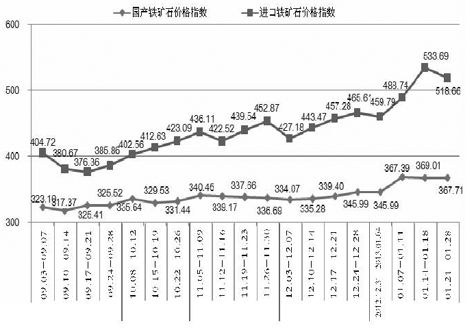 国产铁矿石价格指数与进口铁矿石价格指数走势图
