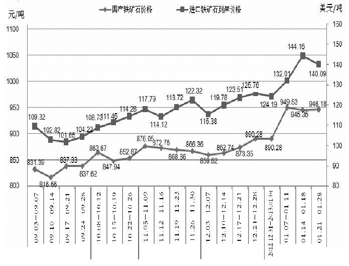 国产铁矿石价格与进口铁矿石价格走势图