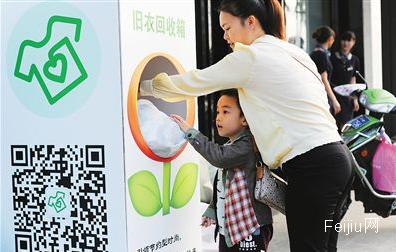 11月16日,海口市民林女士带着孩子拎着一大包旧衣服来到海秀东路银龙电影院旁边商店门前,将旧衣服放置在印有“引领节约时尚,让环保流行起来”的旧衣回收箱中。