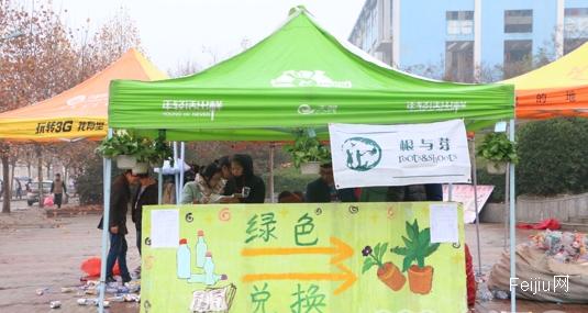 平顶山学院近日在学校扇形广场举办了一场主题为“绿色校园行,环保大家行”的绿色兑换活动。同学们可通过此活动,用废塑料瓶、旧书兑换绿色盆栽为主要内容,可供同学们兑换的绿色盆栽多种多样,包括观音莲、仙人球、莲花兰、金枝玉叶、秋菊等,活动由平顶山学院资源与环境学院“根与芽小组”主办并承办。