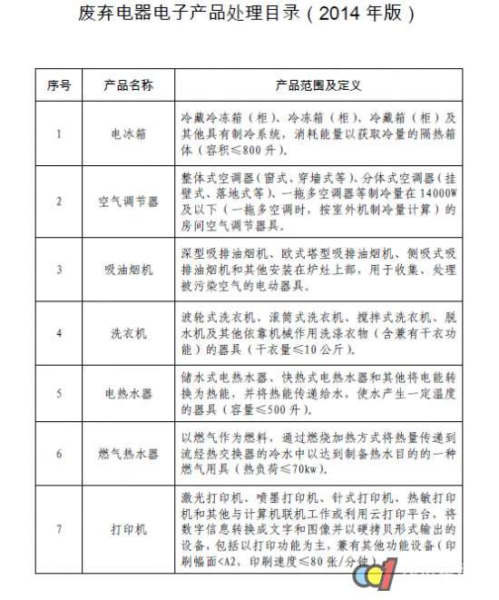 记者了解到,新版目录在第一批目录(冰箱、空调、洗衣机、彩电、电脑)的基础上,将品类扩大至14类,其中新增家电品类有吸油烟机、电热水器、燃气热水器,至此,在废旧电器产品处理目录中,总共有7类家电产品;新增电子类产品有打印机、复印机、传真机、监视器、微型计算机、移动通信手持机以及电话单机。