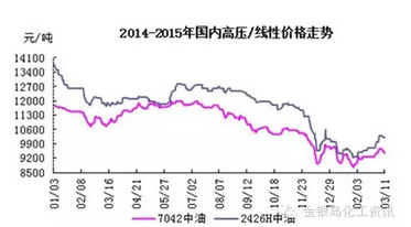 虽然再生料使用减少给新料需求带来一定上升空间,但原油震荡下行,春节期间资源累积,国内煤化工行业低位冲击,2015年一季度 PE行情短暂上涨后再次下滑。整体看市场心态依然乐观,多数贸易商认为目前价位正是历史低位,后期需求提升也无庸置疑,行情下跌空间难以打开,如遇利好,上涨机率依然很大。同时,部分装置检修也将减少资源供应,为上涨夯实基础。