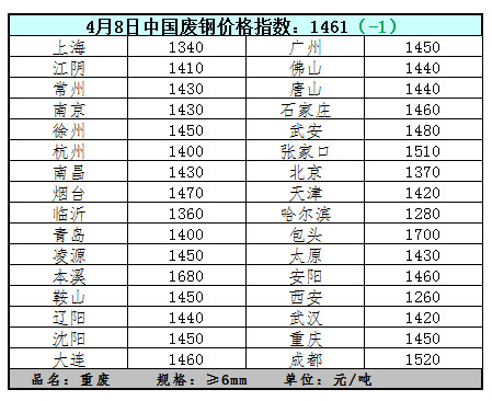4月8日中国废钢价格指数及主流地区价格(图)