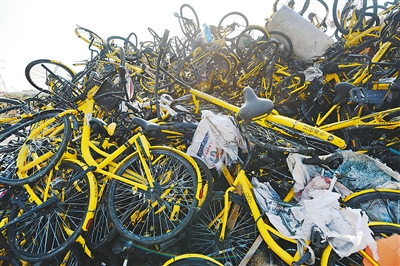 各大城市共享单车投放过多影响了城市交通。图为杭州的一片空地上,由于长时间的存放,大批共享单车与垃圾堆放在一起,加大了处理这些单车的难度。 |