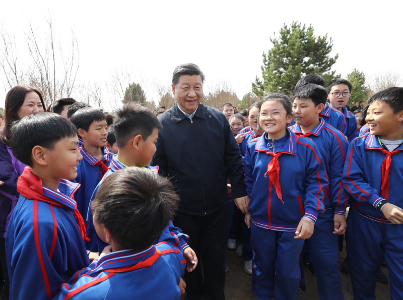 4月8日,党和国家领导人习近平、栗战书、汪洋、王沪宁、赵乐际、韩正、王岐山等来到北京市通州区永顺镇参加首都义务植树活动。这是习近平同少先队员在一起。新华社记者 鞠鹏 摄
