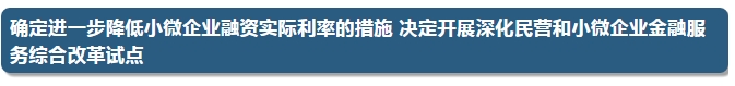 会议指出,按照中央经济工作会议和《政府工作报告》部署,一段时间以来各方面多措并举,小微企业融资成本有所下降。下一步,要坚持实施稳健的货币政策,保持松紧适度,并根据国际国内形势变化适时预调微调,保持流动性合理充裕,确保小微企业贷款实际利率进一步降低。