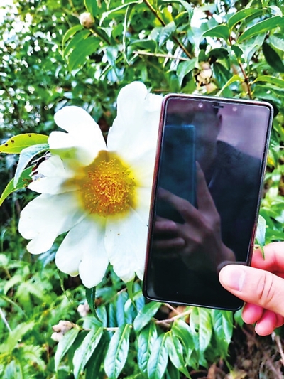 据了解,大苞山茶为山茶科山茶属植物,常生于海拔150-300米的常绿林中,因其花苞巨大而得名,是中国特有种,广东省重点保护野生植物,目前列入了国家重点保护野生植物第二批征求意见名录,野生种群数量比野生大熊猫更为稀少,濒危珍稀程度堪称为植物界的“大熊猫”。大苞山茶嫩枝有微毛,顶芽被毛,叶革质发亮,花形巨大,苞被片不脱落,生长于低海拔丘陵山地的水边、林缘和疏林中,耐蔽荫,耐瘠薄,园林应用前景广阔。据现场工作人员介绍,大苞山茶的花直径达16cm,相当于一部手机大小,花为白色,花蕊为黄色,具有观赏价值。
