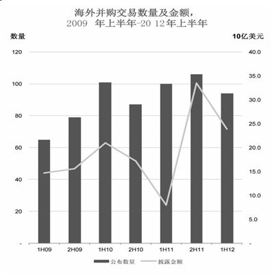 昨天,普华永道公布的一份报告显示,全球宏观经济的不景气并没有影响中国的海外并购交易,尽管并购数量略减6%,但金额是去年同期的近三倍。并购地区排位第一的是北美洲,其次是欧洲,而以往中国海外并购最热点的区域是亚洲。 中企逆势交易230亿美元 这份名为《2012年上半年并购交易回顾与前瞻》的报告显示,全球经济低迷,2012年上半年,在境外战略投资者在华并购数量大降42%、境内战略投资者在本地并购也减少25%的情况下,中国企业海外并购逆势上扬,海外并购交易数量94宗基本与2011年处在同一水平(仅下降了6%);交易金额230亿美元,几乎是2011年上半年的79亿美元的三倍。 并购多在技术和能源领域 普华永道中国北京咨询服务部主管合伙人卢玉彪表示,中企正大力并购海外能源类和工业技术密集型企业。上半年,中企海外并购发生在北美洲数量增加到有31宗,欧洲27宗基本维持去年同期的量,亚洲则从29宗锐减到12宗。除了上述北半球国家,在南半球并购数量也增加到20宗。 ■分析 今年海外并购或创纪录 普华永道方面预计,今年全年,中国海外并购将超过去年,成为创纪录的一年。卢玉彪称,中国海外并购的趋势很有可能会继续,交易的数量和规模都将增大。 他认为,这种现象是由多个因素共同驱动的,其一是中企因并购经验而增强了信心;另外对资源和技术的战略性需求以及绝佳的海外买入机会都推动并购。